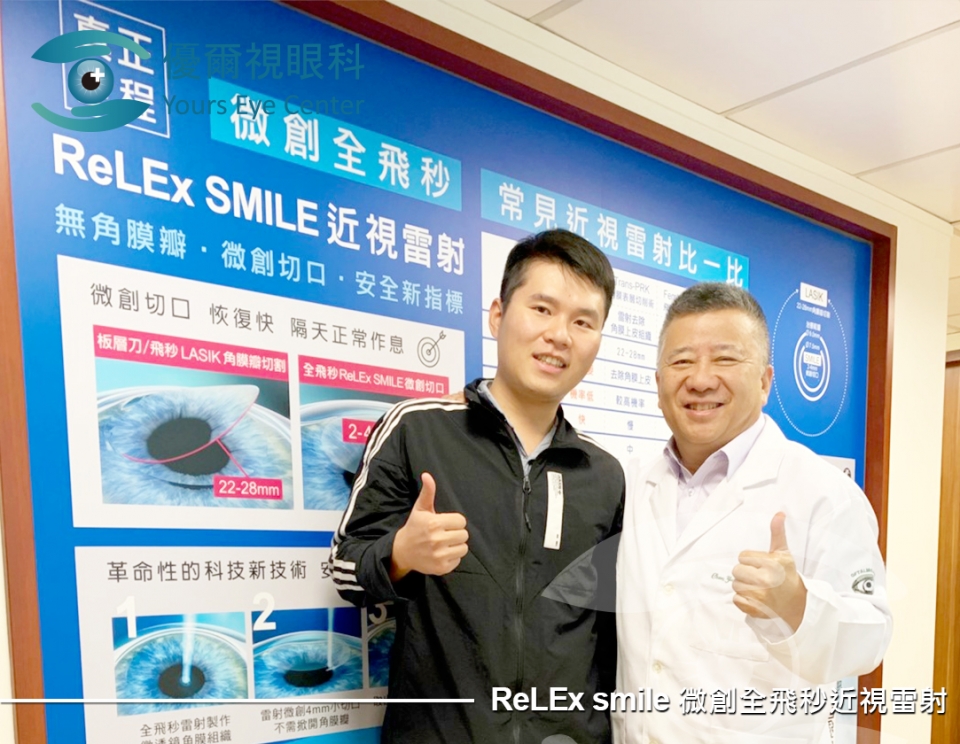 在PTT爬文後,認為『SMILE全飛秒近視雷射』是對眼睛傷害較小的手術方式,而陳永煌醫生在SMILE雷射手術已有高知名度,網路上亦一致好評,因此選擇優爾視眼科。